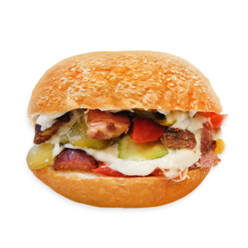 Kebab Garniță - carne garniță 150g, chiflă 120g, cartofi prăjiți 50g, roșii 20g, castraveți // castraveți murați 20g, salată de varză 20g , ketchup 15g, maioneză 15g