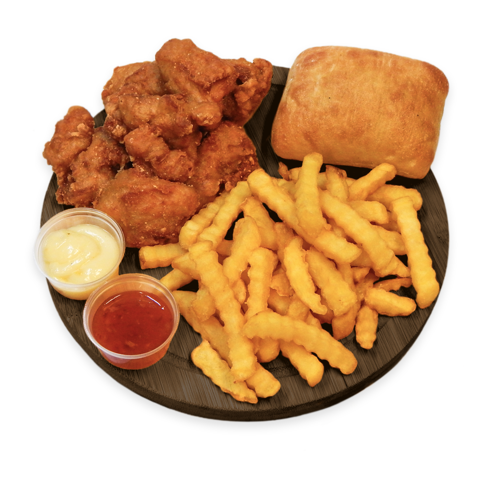 Pulpă de pui Kaarage (Stil Japonez) 230g, cartofi prăjiți 150g, chiflă ciabatta 60g, salată la alegere 50g