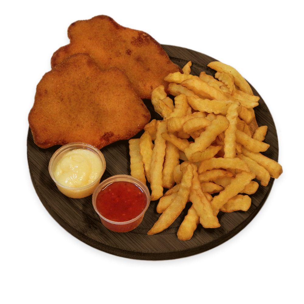 2 buc. șnițel pui pane 170g, cartofi prăjiți 150g, chiflă ciabatta 60g, salată la alegere 50g