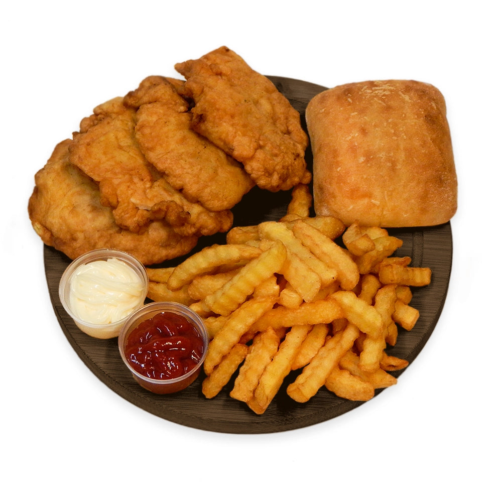 4 buc. șnițel piept pui 250g, cartofi prăjiți 150g, chiflă ciabatta 60g, salată la alegere 50g