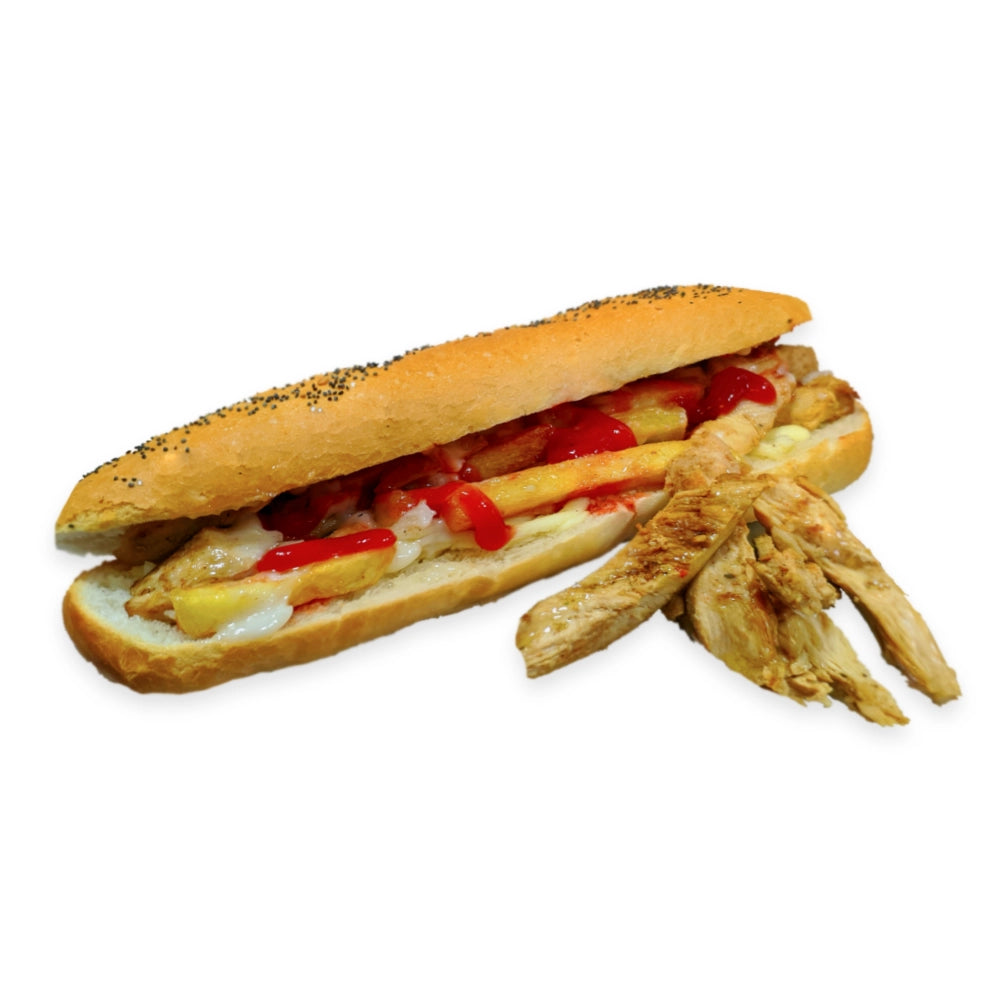 Toast Baghetă Pui,- baghetă toast 80g, piept pui grătar 60g, cartofi prăjiți 30g, mozzarella 30g, felie cheese 18g, maioneză 10g